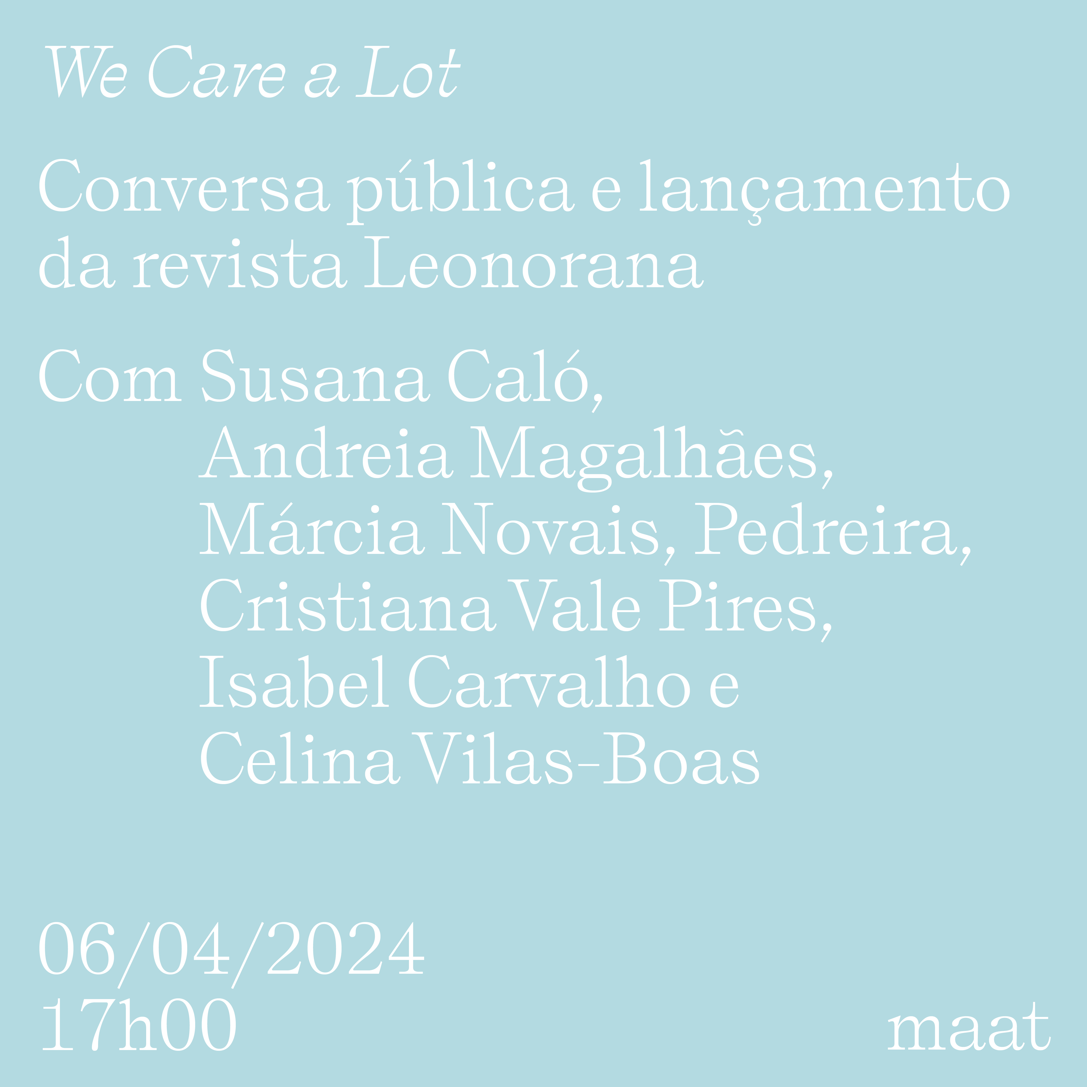 Lançamento da Leonorana #7 We Care a Lot no maat [Lisboa] com Isabel Carvalho, Susana Caló, Andreia Magalhães, Márcia Novais, Pedreira e Cristiana Vale Pires, com moderação de Celina Vilas-Boas. Launch of Leonorana #7 We Care a Lot at maat [Lisbon] with Isabel Carvalho, Susana Caló, Andreia Magalhães, Márcia Novais, Pedreira, and Cristiana Vale Pires, moderated by Celina Vilas-Boas.